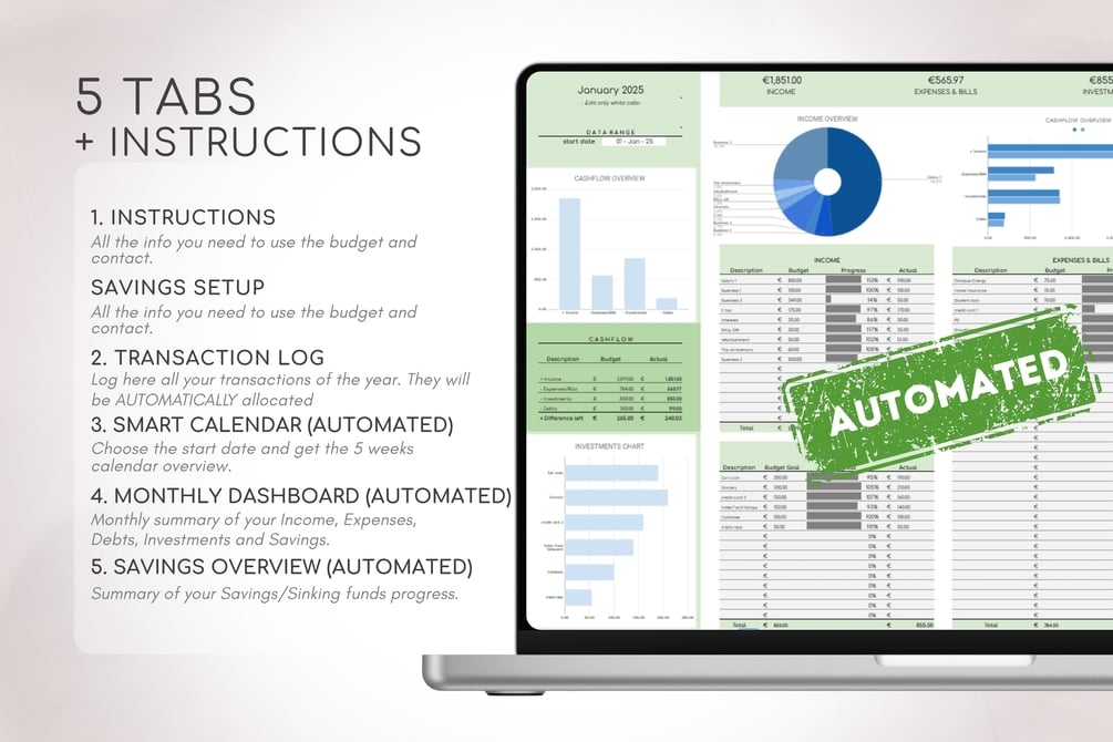 ✓Automated Summaries: Get an instant overview of your income, Expenses, Savings, Debts, Investments and remaining balance.