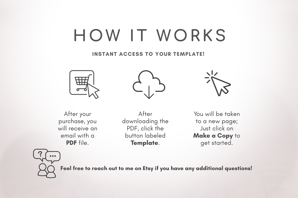 HOW TO ACCESS YOUR FILE: Once your payment is processed, you'll receive a Pdf containing the link to the file . MAKE YOUR COPY and you are ready to go!